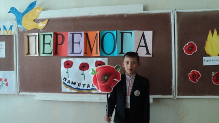 7 травня у 6 класі проведена класна година "Пам'ятаємо. Перемагаємо". Разом зі своїм класним керівником Солодовник Л. В. учні поринули в історичне минуле нашого краю - Богодухівщини, в буремні роки війни з фашистськими загарбниками. Згадали події визволення Богодухівщини, геероїв, які полягли в боях за наш край. Класним керівником була підготовлена виставка книг на воєнну тематику, а по завершенню діти виготовили святкову символіку до Дня Перемоги.