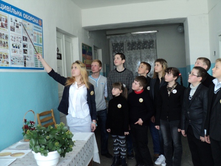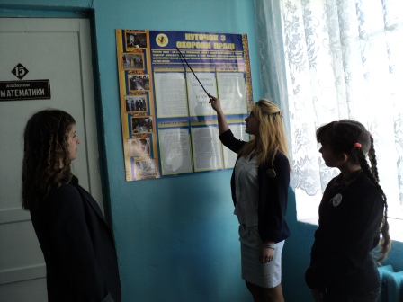 Долучилися до цієї акції і наші школярі. Вчитель фізики Полякова Н. Ю. провела урок на тему "Охорона праці - це збереження життя і здоров'я людини". Старшокласники проводили інструктаж для молодших школярів з приводу безпеки на ігровому майданчику, Юденко Діана, учениця 9 класу провела міні-екскурсію по школі на тему "Де можна почерпнути інформацію щодо охорони праці у школі?"