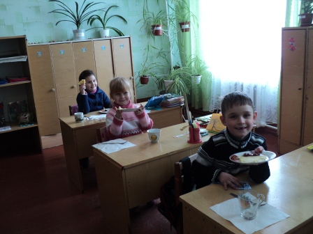 23 лютого свято Масляної завітало до першокласників. Їхня вчителька Шульженко Віра Олексіївна показувала в класі, як народжуються оті смачненькі млинчики, що для того треба. А потім усі смакували отими золотистими сонечками. І головне не те, що млинчики були смачні, а те, який настрій панував у класі, які посмішки осявали обличча малюків. Народжувалося диво, диво єдиної класної родини, маленької, але такої теплої і світлої!